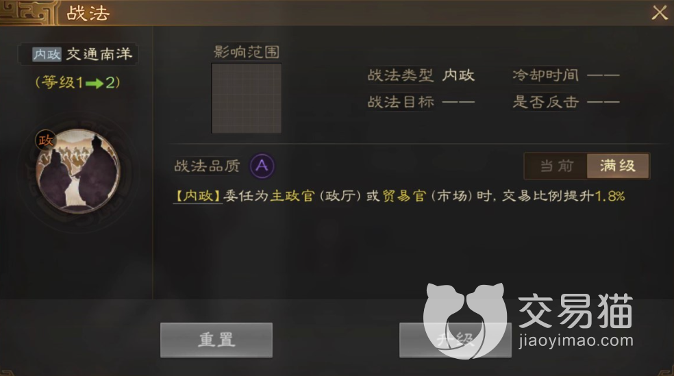 作为内政战法的技能虽然没有任何的输出,但是”交通南阳“的效果却能够在交易的时候产生作用,当吕岱作为主政官或者贸易官的时候,商人之间的交易比例是最高能够提升1.8%的交易。因此能够促进国家的贸易交流。