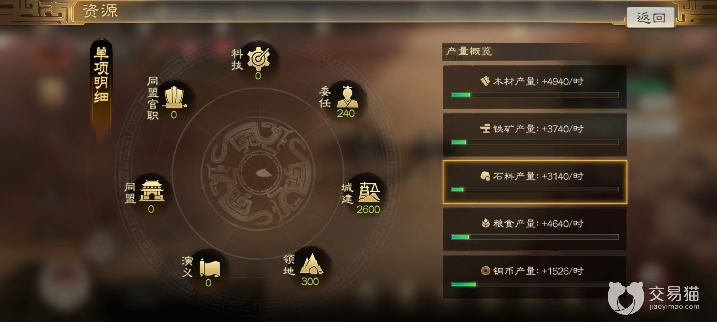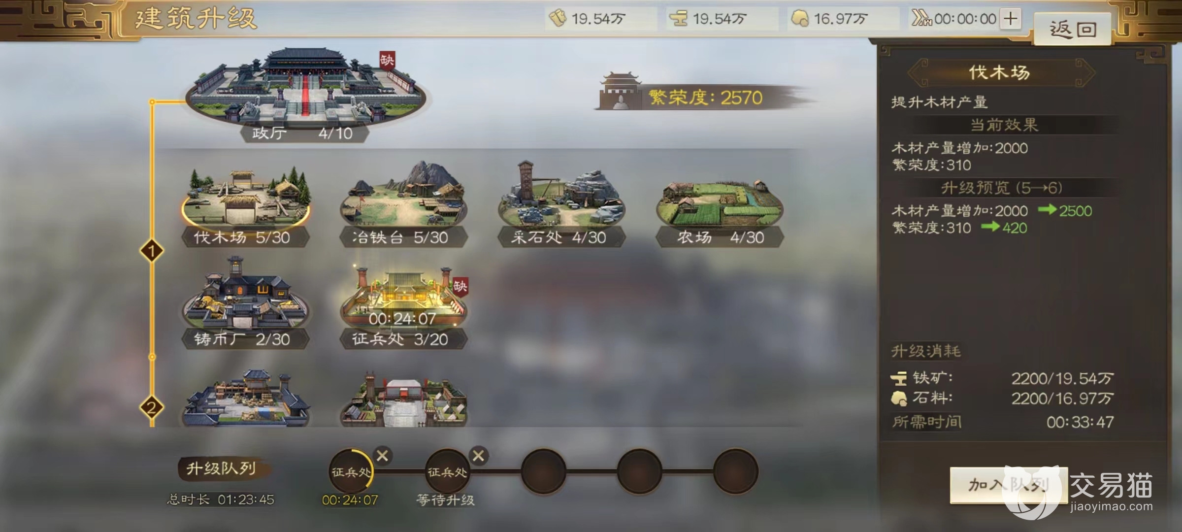 接下来是4种可以提升资源产量建筑,分别是伐木场,采石场,农场,冶铁场,对应资源为木材,石料,粮食和铁矿,在征兵和升级建筑中都是非常重要的道具。这4种建筑同样可以委任对应主政官,利用他们的政治加成和战法来带来资源提升,当野外土地陷入到困境中时,主城中资源获取就成为重要来源。另外一项和获取资源相关的就是铸币厂,可以提高铜币产量,并且当建筑达到5级以上可以开启征税功能。小编建议是优先升级,因为铜币关系到战法点获取,越多积累铜币就意味着武将战法等级也将得到更快提升,和战力挂钩。说到资源还有一个建筑必须要及时升级,那就是仓库,能够提高存储上限,储存更多的木头、铁矿等,如果仓库达到上限则不能继续获取资源,非常浪费。