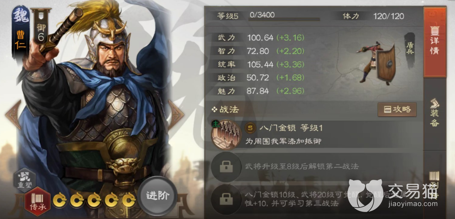 第二天就是名将曹仁了,该角色的强度在前期绝对是人手一个的存在,作为坦克可以成为带领整个队伍的核心角色,有这个角色的萌新前期基本上是没有任何害怕的敌人的,快速占领周围的资源的时候让他带队绝对没错。