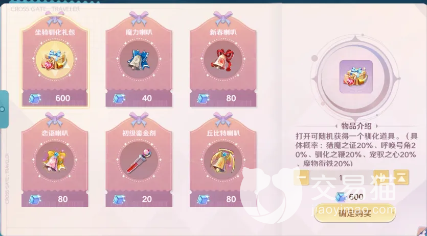 商城里还有一处驯化类物品出售界面,其实就是魔币商城,在这里比较值得入手的就是坐骑驯化的商品了,在其中能够随机获取到一份驯化道具,这个是能够帮助各位去驯服坐骑的,而其他的东西就是各种样式的喇叭,这个对大家的作用就不是很大了,所以通常情况下就可以不用去购买。