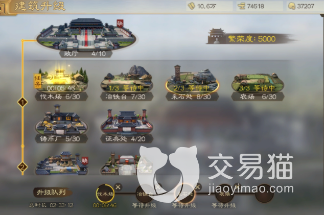 游戏里粮食的主要来源就是农场,农场和冶铁台,伐木场等设施一样,属于最基础的一级设施,每小时生产粮食的数量受等级和时间加速决定,等级越高给的粮食也越多,对应的木材铁矿前期能搞多少也搞多少吧。