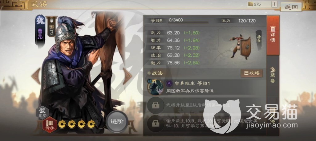 曹昂在游戏里统率盾兵,也就是说承担前排的责任,武力值、统率值都在紫卡平均线之上,自带战法属于被动光环,能降低周围2格范围内敌军的兵刃伤害,最大降幅26%,辅以提升武力值的特性使其在盾兵中的兵刃输出还是不错的。其他战法推荐用百折不挠来一步提升坦度。