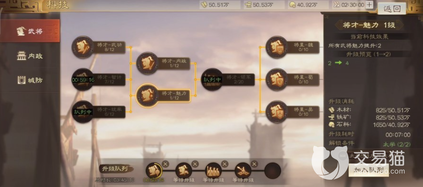 大家在游戏中先找到科技按钮,然后点击进来之后可以看到左边有三个选项,第一个选项是武将,第二个为内政,第三个为城防,在武将中又有很多的属性,不同属性可以给武将带来不同的增益作用,比如说第一个大家若是给该选项进行提升的话,就可以将武将的各方面能力进行提高等级了,而升级列表的话,就在最下面一排可以看到,它是依次进行升级的,当大家第一个属性提高后就能自动升级第二个了,后面的也是。