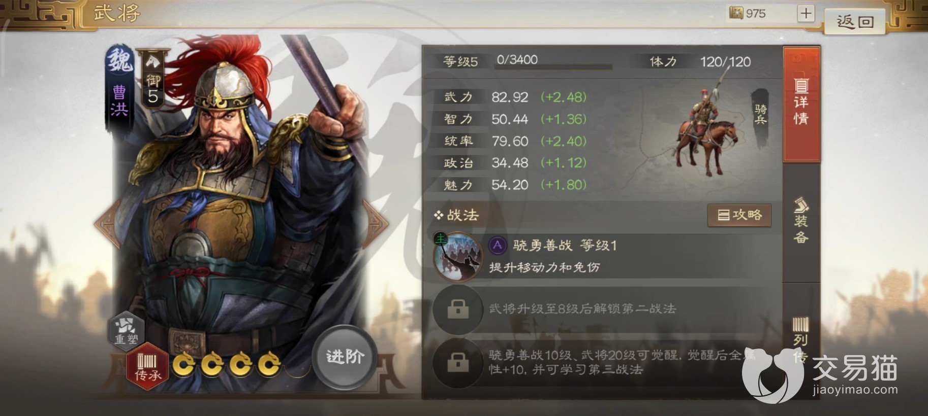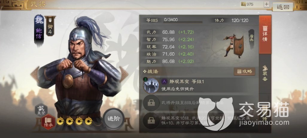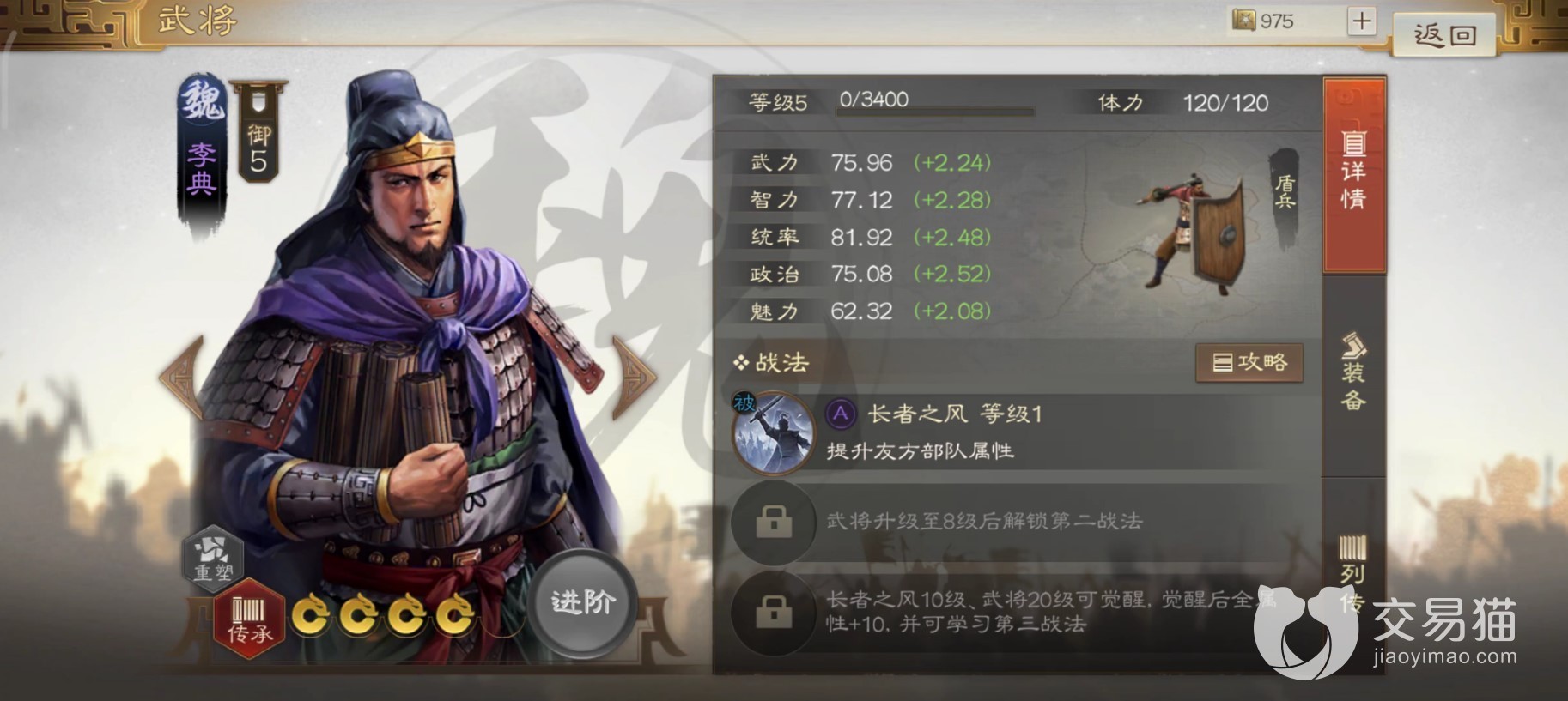 他的最大特色在于能强制敌将反向移动2格,当有敌方骑兵突入我方后排的时候,使用这个技能就能有效的对其进行限制,使其不容易近身。阵容搭配方面首先前排承伤位,推荐用鲍信和李典,前者有3回合的超级免伤(68%),坦度极高;后者能提升大范围内己方的武力与智力,这两位摆在前怕敌人难以轻易突破。