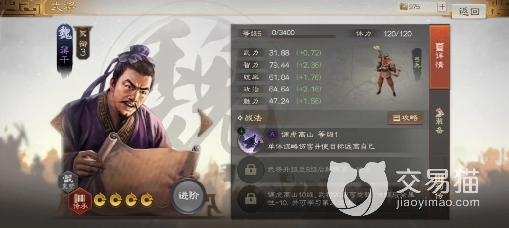 蒋干智力属性突出,又统率弓兵,后排谋略输出的定位其实也比较清晰了。其自带战法能够造成单体谋略伤害,并使其反向移动2格。自身也有小额免伤用来弥补在兵力上的数值低下。