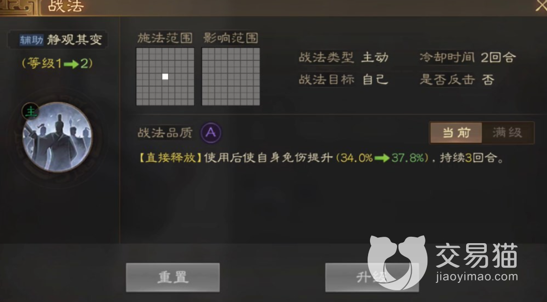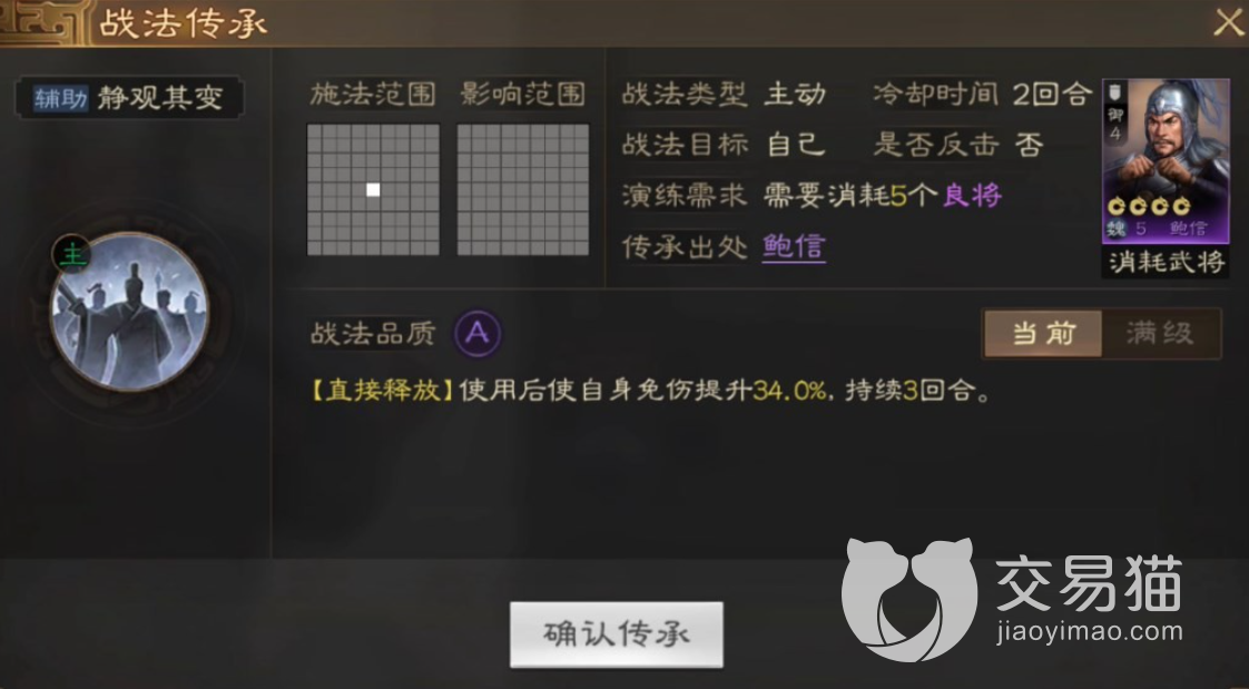 鲍信作为内政武将,这个角色的战法主要的作用就是为自己免伤,名叫静观其变。因此在游戏战斗当中是没办法发挥什么作用的,小伙伴如果想要使用这个角色最好的就是在游戏当中多利用鲍信内政的提升的数值建设自己的城池。