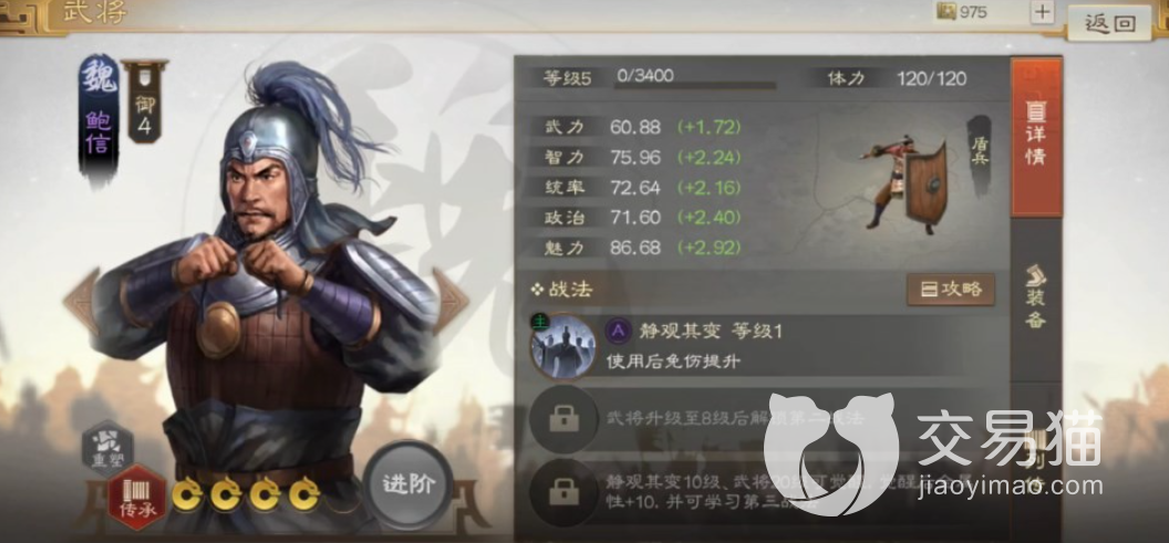 魏国武将鲍信的整体属性都是非常的不错的,魅力更加突出。虽然如此但是玩家们如果想要使用鲍信加入阵容当中并不是非常正确的选择,因为鲍信在游戏当中并不是一个能够上战场的英雄。
