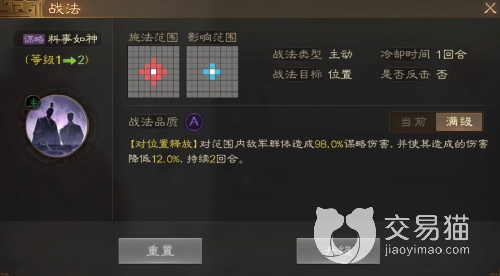 战法技能“料事如神”在战队的时候能够对敌军群体造成大量的谋略伤害,而且敌军其后造成的伤害能够降低12%。虽然这个战法技能没有很高的伤害输出,但是群体攻击造成的伤害还是非常可观的,最重要的是能够降低敌军的伤害是作为一名辅助性武将最重要的,能够最大程度的保证队伍的生存环境。