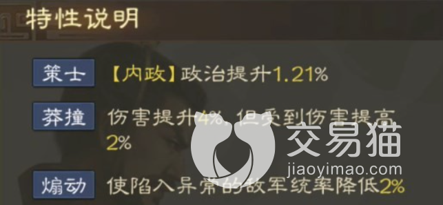 而伍孚的特性则是包含了内政和战斗的,策士能够提升政治能力的1.21%,而莽撞能够提升伍孚4%的伤害,但是受到的伤害会增加2%。如果敌军不是暴力队那么使用伍孚还是非常不错的。