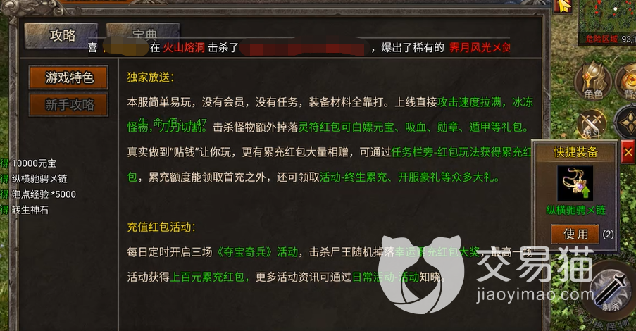 该游戏具有攻速拉满,刀刀切割且能冰冻怪物的特性,所以前期即使装备技能不够强力也无需担心打不过怪物,只要肯耐下心来刷副本,很多东西还是能轻松打出来的,所以踊跃打副本是值得坚持的一点。然后它的福利活动会比较多,包括杀怪掉落的红包,这些都需要注意拾取一下,因为能够爆出元宝这种重要的物资。