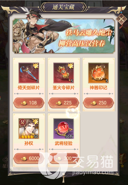 当玩家通关过关斩将的时候会开启通关宝藏的,而在通关宝藏的商城中经常会刷新一些武将碎片,玩家可以使用元宝直接购买。
