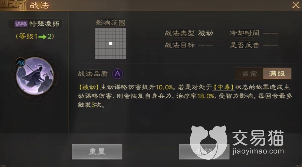 在游戏中也专门为了张让打造的全新的战法技能“恃强凌弱”。主动谋略战法提升10%,如果敌人处于中毒状态,那么自身能够回复兵力,同时治疗18%的血量。因此在战斗中如果有一个能够让敌人群体都陷入中毒效果的武将能够配合的话,那么张让在前排抗输出还是非常不错的。