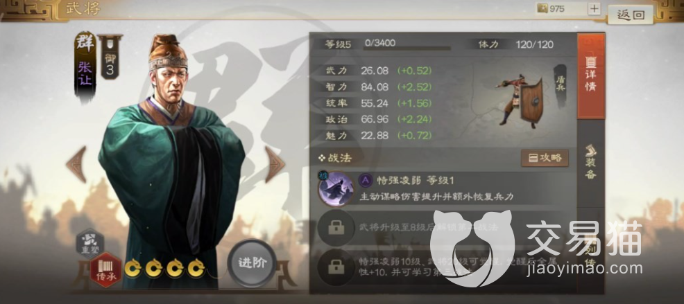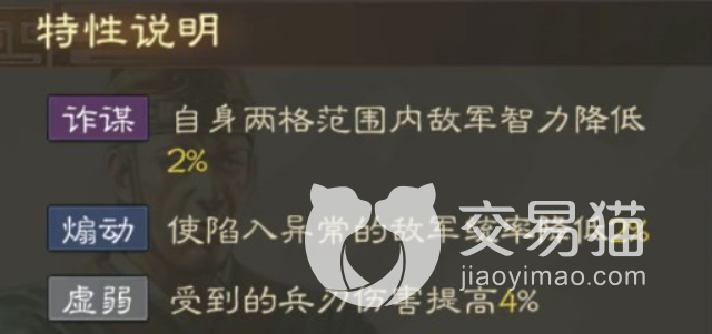 然而张让的特性“诈谋”能够使自身周围两个的敌军智力下降2%,而且“煽动”则能够让陷入异常效果的敌军统率能力降低2%。所以在游戏中张让是一名偏肉盾、辅助的武将,不仅能够为队伍抗伤害,而且能够降低敌军的属性。