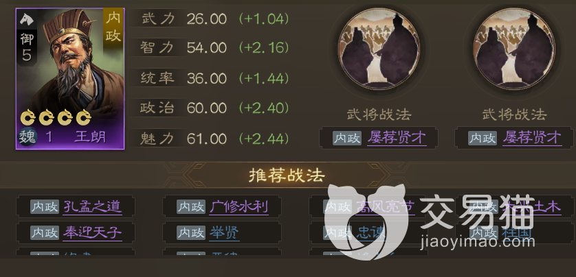 那么讲到这里,“三国志战棋版王朗怎么样”这个问题差不多也可以得出结论了,它作为一个偏向内政的智将,是非常不善于战斗的,而且他的两个战法也必须要玩家将其任命为主政官时才能生效,所以只适合前期缺少此类人才时入手。