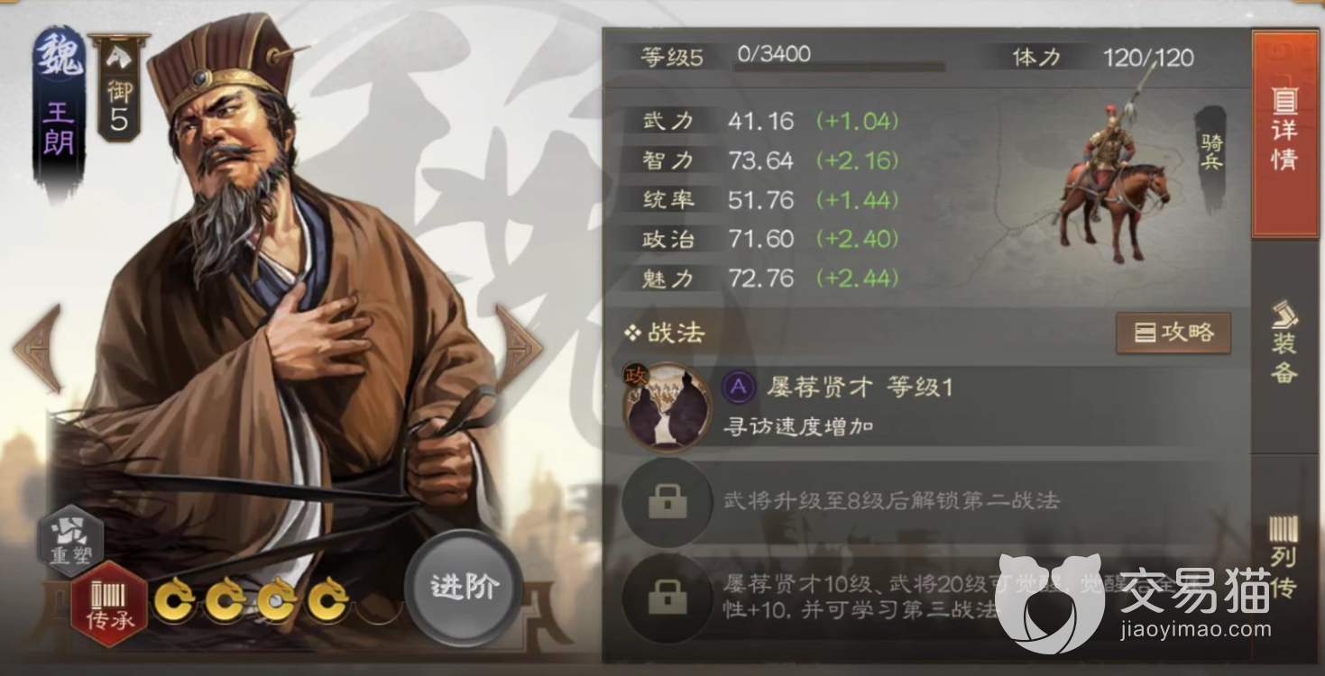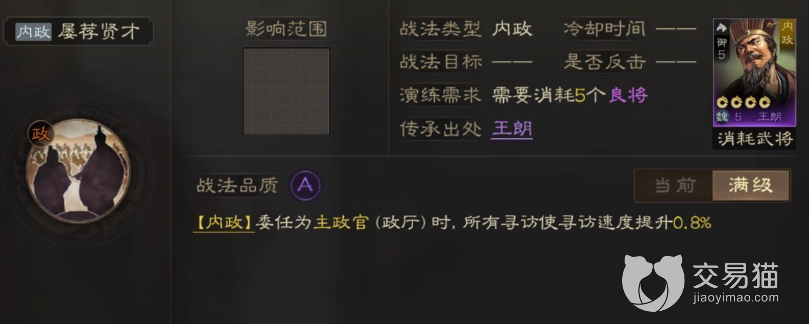 其自带战法和第二个传承战法都是相同的“履荐贤才”,它们的作用是让王朗被委任为主政官时寻访使的寻访速度提升0.8%,当然,这个数值需要升到满级才能达到,概率加上去以后,玩家也能有更大的机会招募到高品质的武将,从而为日后的阵容组建打下基础。