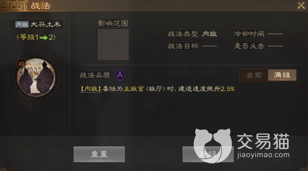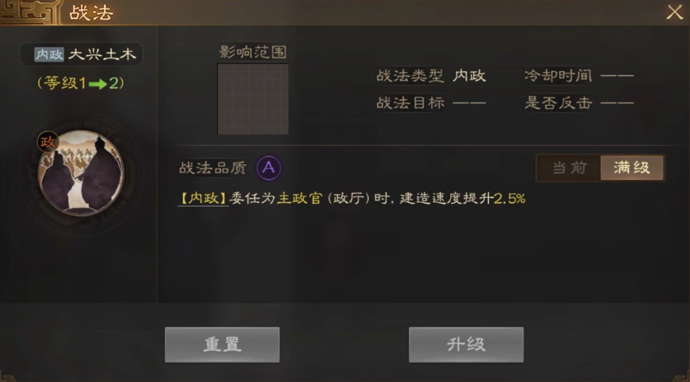 伊籍作为一名官员没有较高的属性,而且属性相比较其他类型的官员相比也十分平庸。但是从他的技能来看他的战法品质是A,而且是属于内政型战法,当委任主政官时,建造速度提升2.5%。因为游戏中建筑的建造时间玩家是无法通过够来买获得的,因此在发生战斗的时候时间是尤为宝贵的。