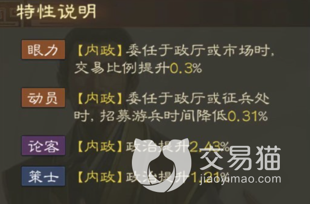 而伊籍的特性是眼力、动员、论客、策士。这些特性的属性加成分别是委任政厅或者市场时,交易比例提升0.3%,这点对于玩家来说能够大大的促进贸易之间的交流。而委任政厅或者征兵处的时候招募游兵的时间奖励0.31%,如果玩家在缺少兵源时候可以使用。而论客和策士则焚天是提升2.43%和1.21%的政治。
