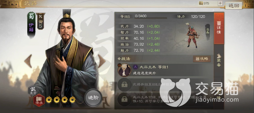 作为一名内政文官伊籍并不适合上战场,但是伊籍的特性加成还是比较高的,所以玩家在没有更高属性加成的内政文官的情况下完全可以使用伊籍作为自己的主政官。