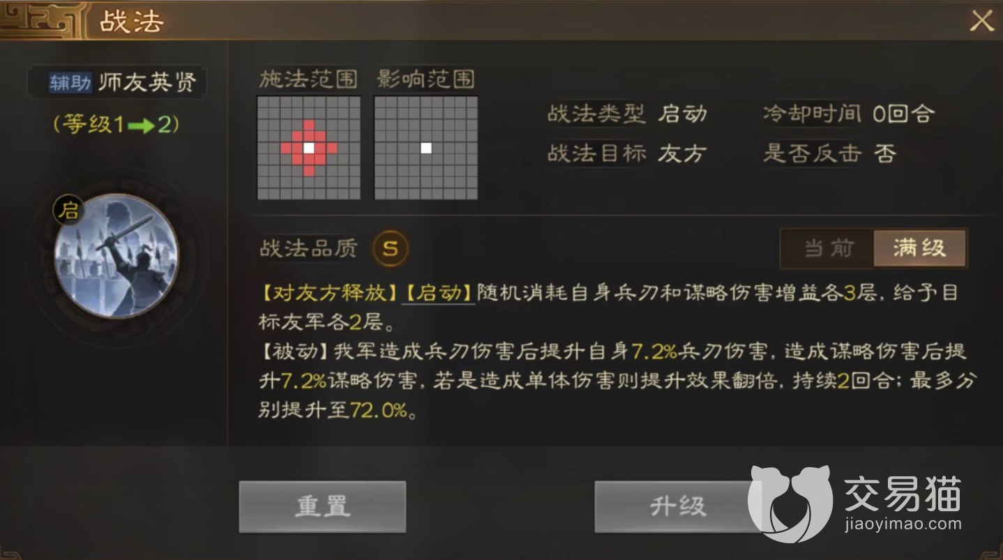 消耗自身的兵力对自身的兵刃和谋略伤害增益三层,同时可以给友军增益2层。而我方在造成伤害之后可以提升自身7.2%的伤害,如果是单体攻击那么提升加成翻倍。