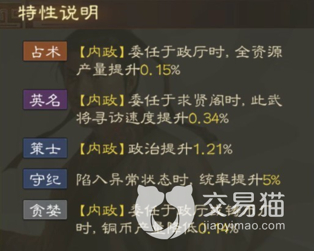 但是吕范还有贪婪的特性,当委任政厅或铸币厂时铜币产量会奖励0.14%,因此玩家在不缺少铜钱缺少其他资源的情况下可以将吕范委任政厅,不然一般情况下还是将吕范派遣到求贤阁比较好。