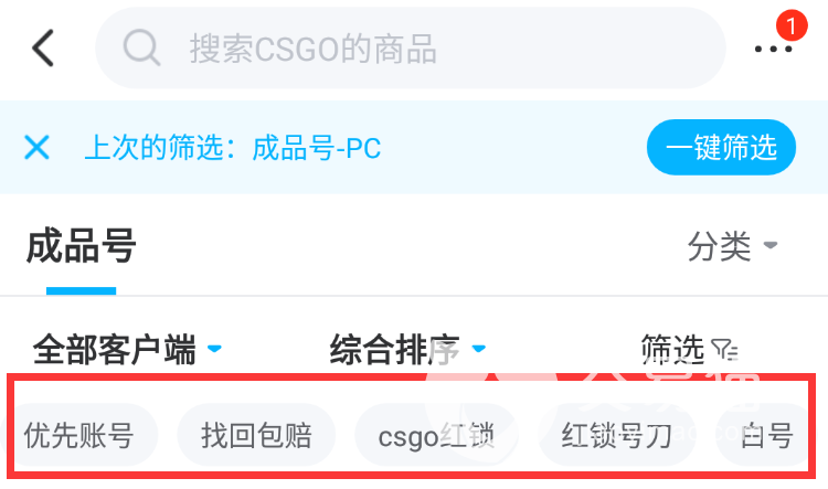 1.软件自带筛选功能,并且用起来非常方便,在任意一款游戏的专区中,都有类似功能,就拿CSGO来说,可以看到图示红框的位置,有着众多选择,大家可以根据自己的需要进行勾选,随后平台会为大家进行相关推荐,这样一来节省了用户们浏览账号的时间,也可以更直接的找到自己心仪的账号。