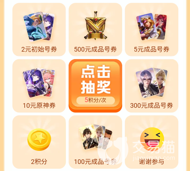 2.签到攒积分,积分当钱花的同时,还可以用来抽奖,在购买账号时,一个积分可以抵扣成0.01元,虽然不多,但架不住个别玩家仓鼠一般的囤货能力,积分攒多了之后,抵扣的也就多了,另外每消耗5个积分还可以进行一次抽奖,其中最高面额为500元的优惠券,非常划算。
