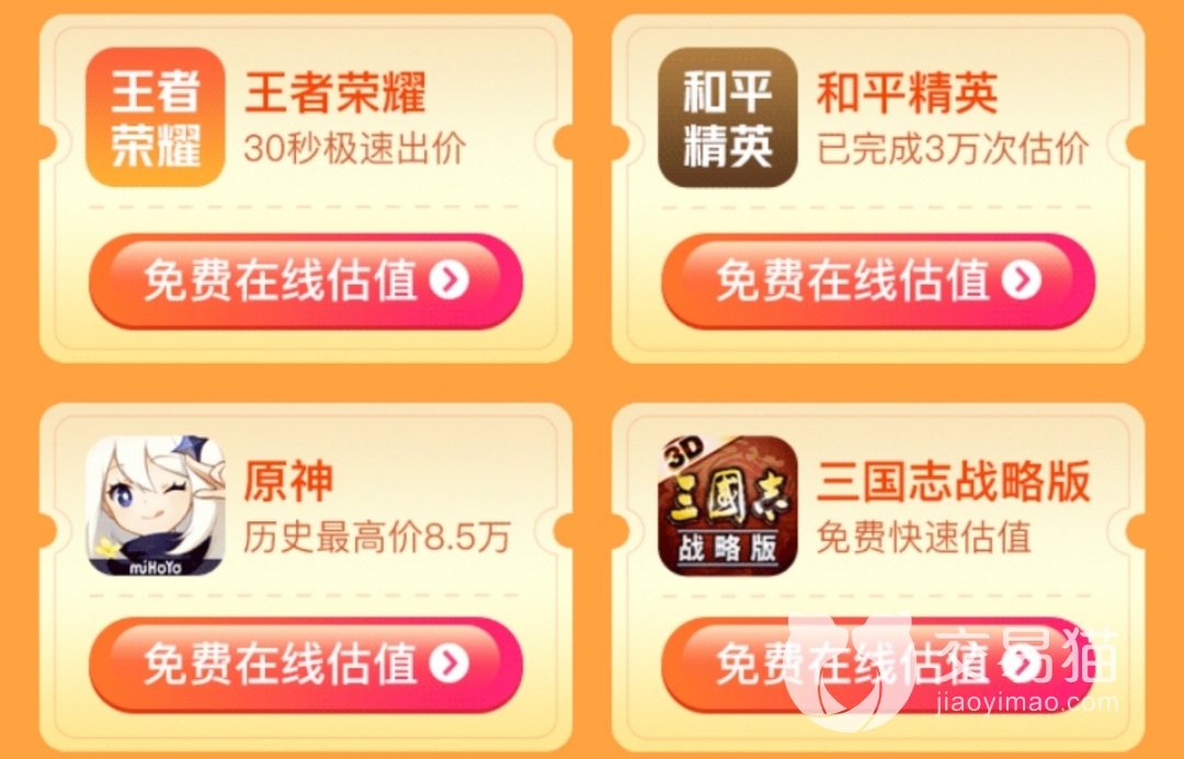 交易猫的系统估价针对的是四款热门游戏,王者荣耀恰好是其中之一,来到估值板块然后就可以开始给账号估价了。它可以免费估值,也就是所有的用户都能来估值,前期不需要缴纳任何费用,大家只要填好账号资料 ,等待系统估价就可以了。
