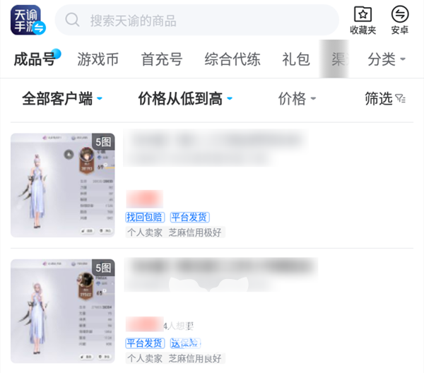 在交易猫的天谕手游交易专区中,大家能够使用多种工具来快速定位到符合自己需求的商品。比如在条件筛选中,就能够根据客户端、账号类型来筛选,避免出现买到号之后发现手机系统不匹配、账号无法登录的情况。在这里大家也能够使用价格或者是性价比来进行排序,快速发现一些低价的优质商品。当然了,如果大家心里有一个价格的预期,也可以通过设定价格区间的方式来发现这些宝贝。