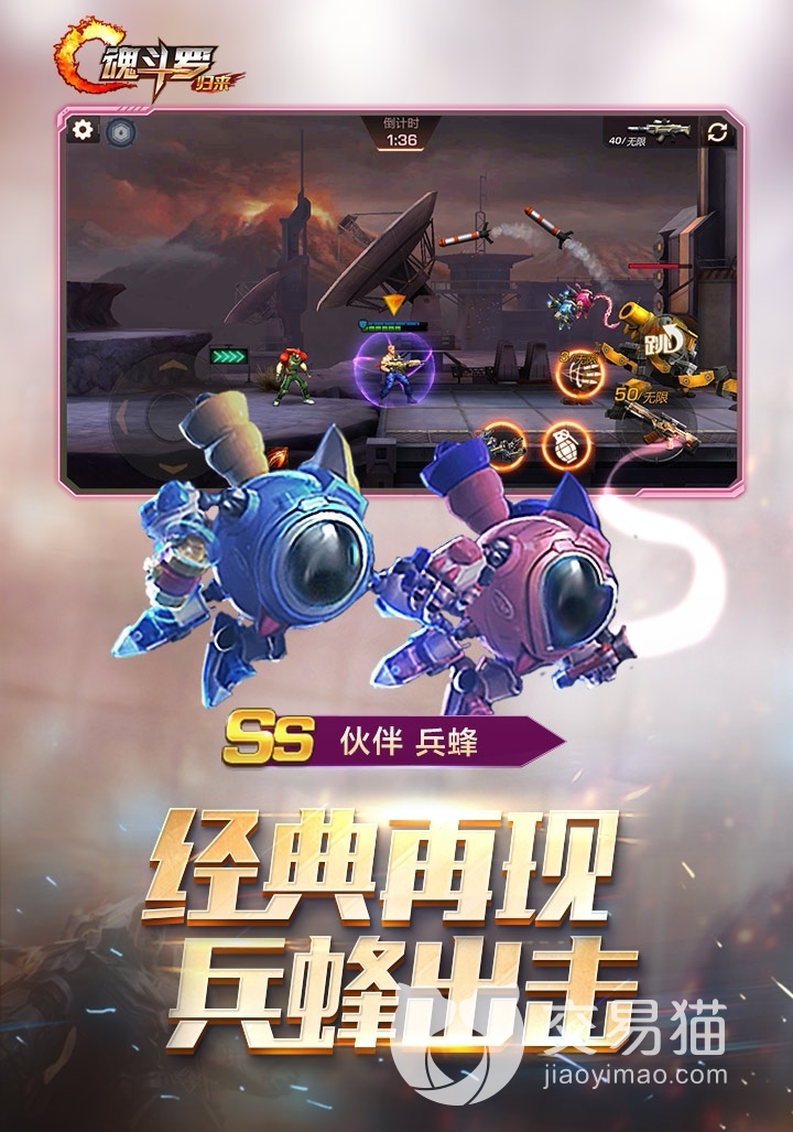 魂斗罗:归来主要是让大家去扮演各种各样的角色去保卫地球,但是这些说起来容易做起来难,还需要大家在不断的比赛和历练中成长,共有六种武器可以让大家去选用,在每一次的战斗当中,大家可以去选两个优势互补的武器去使用,这样才能更好的发挥它的优势,能够让大家在每一次的战斗中都取得胜利。