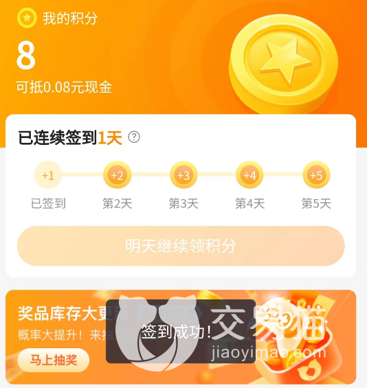 要是觉得活动时间不固定不满意的话,可以再了解一下交易猫积分机制,这个机制是小编见过这么多平台当中最实在的,别人都是登录累积领优惠券,可这里的签到真就是实打实领钱,满一百积分之后就能直接抵现,有时活动也会赠送积分,还能拿积分进行优惠券抽奖,当买家完成一笔交易之后更会按比例来返积分,所以可以说是入驻交易猫时间越久就越便宜。