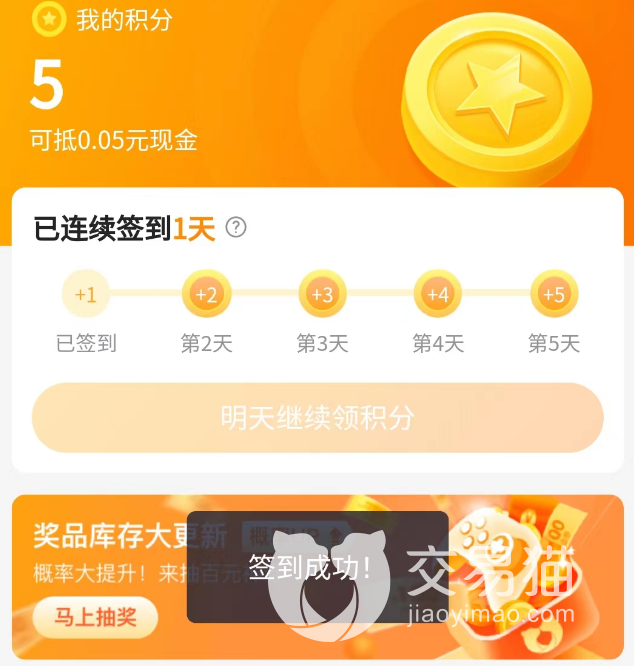 先抛开各式各样活动不说,交易猫始终存在“永恒”优惠政策,那就是每天靠签到获取得来的积分,这个积分可用于抽奖和购买账号时的现金抵扣,有些人可能看着一积分微不足道,但运气好拿去抽奖就能得到几十块钱的优惠券,就算是每天一积分,慢慢积少成多也能为你省下不少钱,更何况交易猫因市场足够大,账号价格都不高,商家们也要打价格战。