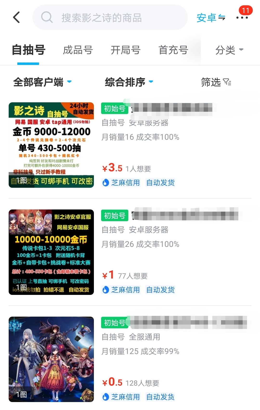 交易猫中“影之诗”游戏交易板块下,目前有三种类型的初始号可购买,分别为自抽号、开局号、首充号,如此多样的账号类型给予买家更大的选择空间,买家可根据自己对资源的需求和预算情况自由选择。