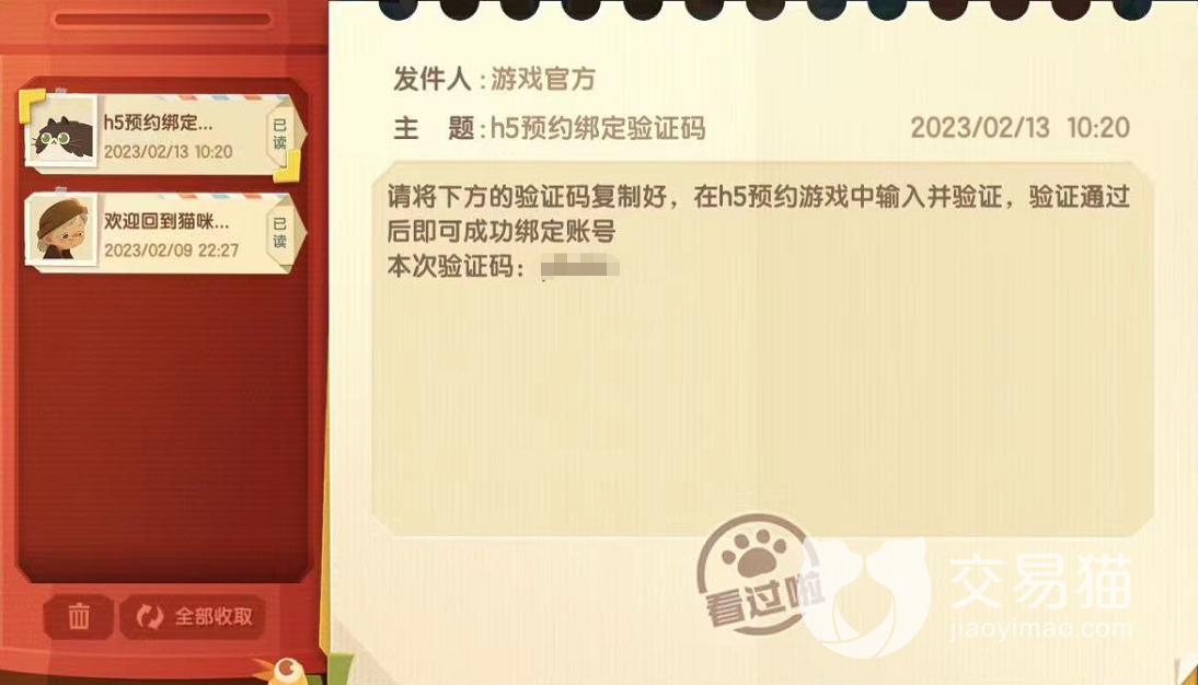 同时也有我们专属的绑定信息,确认之后,玩家们就可以得到一个定制猫猫了,定制猫猫会直接发送到我们的邮件内,玩家们可以在游戏的邮箱内进行查找,第一个就是我们的定制猫咪,同时定制猫咪也会在猫包内,玩家们可以自由养成。