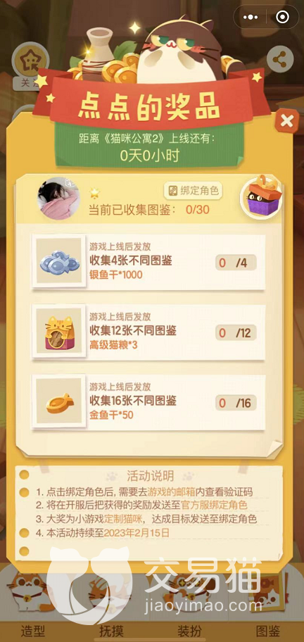想要获取定制猫猫,玩家们一定要先进行绑定,并且解锁更多的任务模式。我们需要打开猫咪公寓2的小程序,在其中点击绑定角色,这里会需要我们输入编码。
