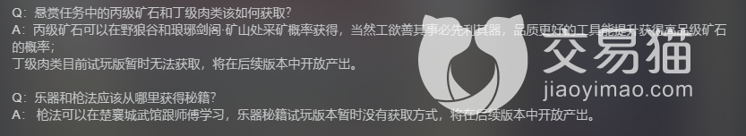 丁级肉食是游戏里的丁级材料,但目前游戏还是新品试玩的测试版,所以并没有丁级肉类,这个也在官方的steam公告中提的很明确,悬赏任务需要的矿石倒是可以在剑阁的矿山等地获得。