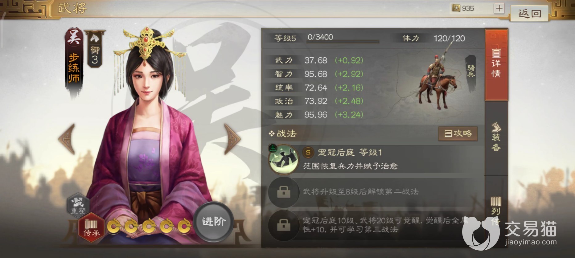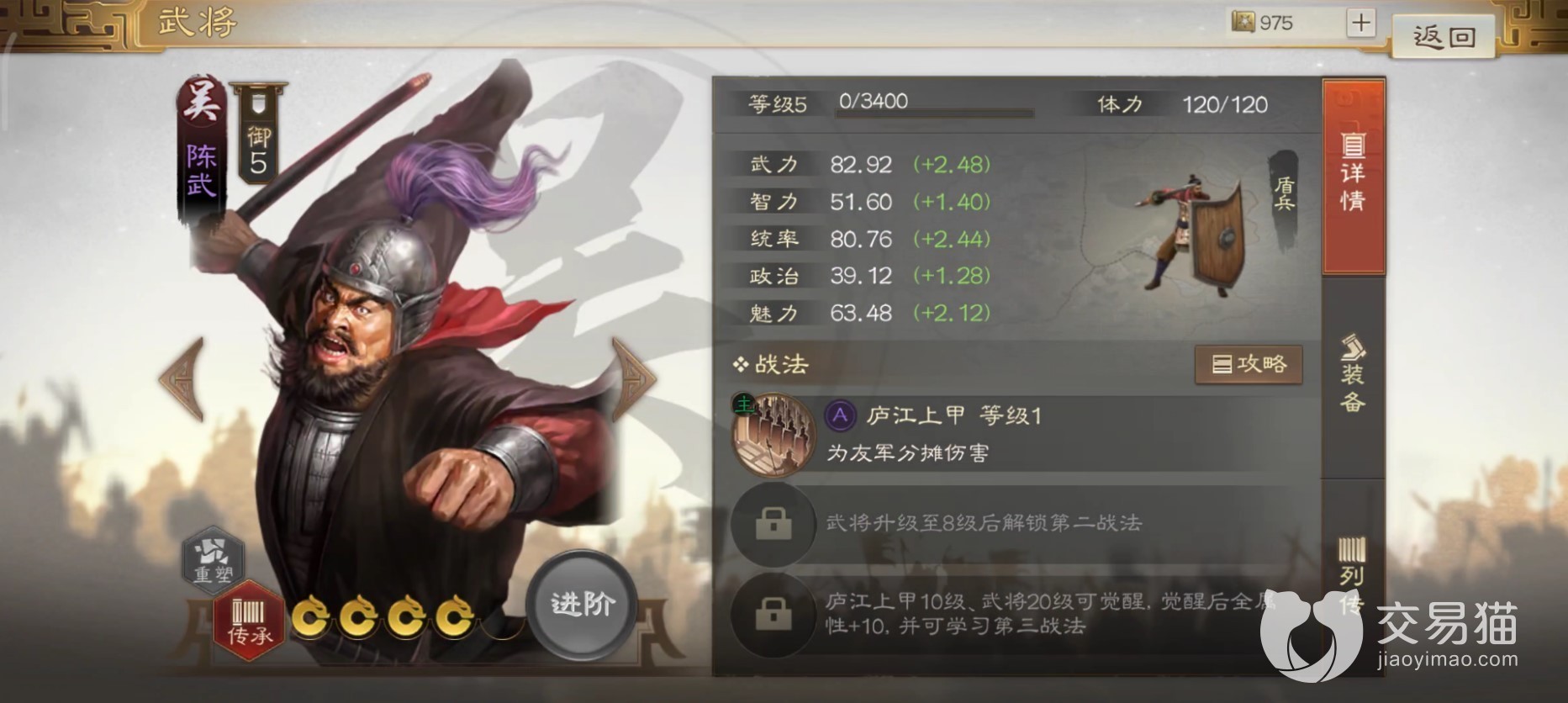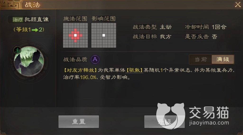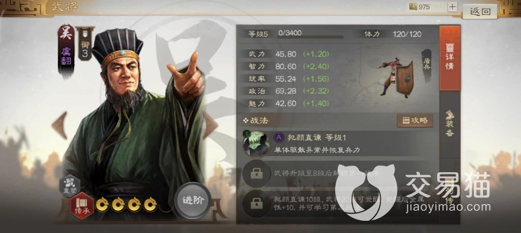 虞翻智力超群,统率值一般,所以作为前排盾兵武将,其抗伤能力一般。不过好歹他的战法能为恢复兵力,外加驱散效果,释放对象不限于自己。自带特性能提升一定的治疗效果,所以实际坦度比属性上所展示的要高一些。