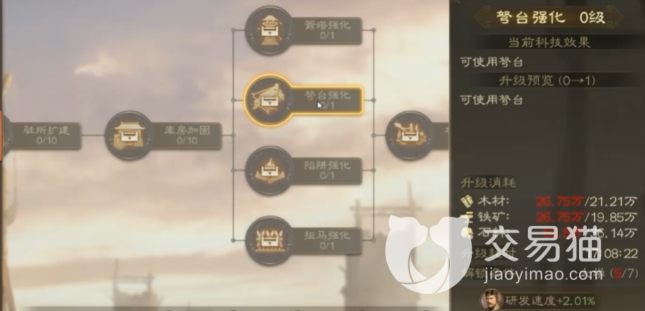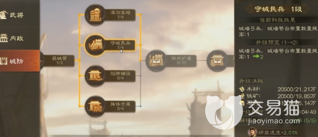 而这个功能的确切位置是在各位自家的太学这个设施中,点击它就会出现对应的界面,然后在此处选择城防就会看到一个树状图一样的东西,这里会有各种设施可以选择,有些还需要进行解锁,这里也可以进行不同设施的等级提升,让其能能够发挥更重要的作用。