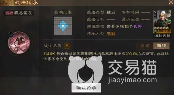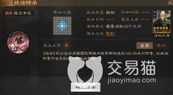第二个名为猛志常在,当角色自己死了之后,会直接对周边两格以内的所有敌军造成145%的兵刃伤害,而且不管此时角色他自己的兵力如何,这个伤害是固定会打出来的,不会受到角色的兵力影响。