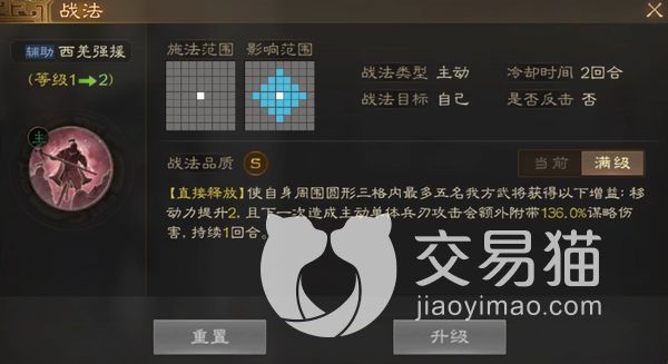 关于这个角色的战法选择,推荐大家可以带上两个,第一个叫做西羌强援,他在游戏中的主要作用是可以给自家队友提供移动力的提升以及攻击还会带来额外伤害效果,那大家把这个技能升到满级之后,他能让角色自己身边的最多五名队友都能将其移动力提升两点,而且对敌人的下一次兵刃伤害则还能再附带136%的谋略性伤害,这个效果还能持续一个回合。