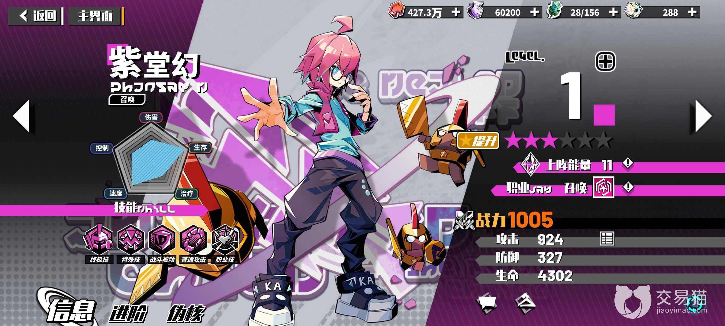 同理紫堂幻这个角色也是可以升星达到橙色的角色,碎片的获取和凯莉基本上一样,而且这些角色都有一个特点就是消耗的上场能量少,有时候两个可以抵得上一个天生的橙色角色。