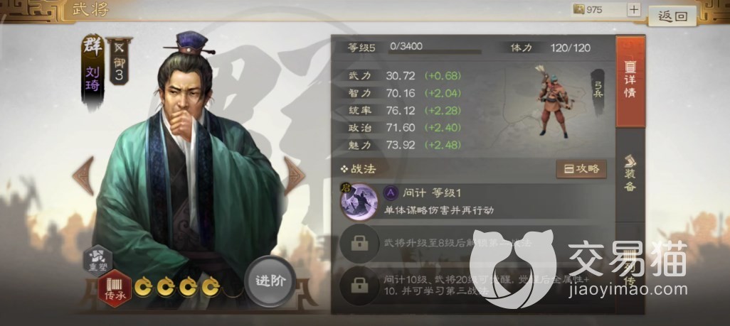 刘琦在游戏里是紫色武将,5维属性除了武力其他都还不错,自带战法可以对单体造成谋略伤害,并且释放技能之后继续行动。“再动”这种技能在战棋游戏里还是蛮常见的,在游戏前期挺适合发挥的,可以在输出之后快速移动到更为安全的方格内,例如援护武将的附近,或者一些地形。