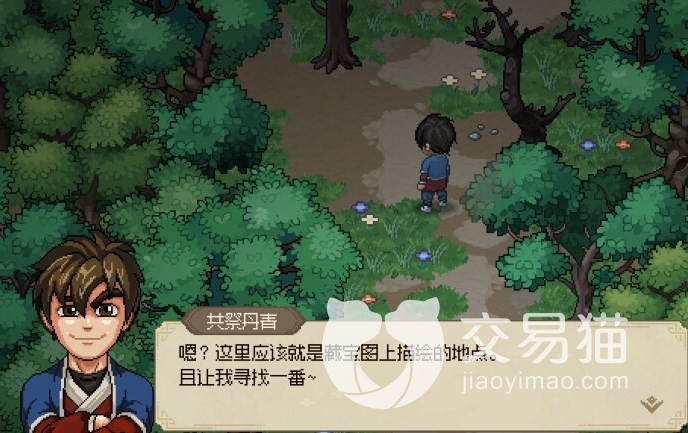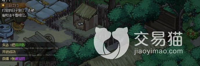然后在无名村的村长家右边柴木堆可以使用攻击键将木柴打碎,然后会发现宝箱,这里用铜钥匙解锁后就会发现藏宝图。根据提示找到树林里的特定位置,即可挖宝获得道具了。