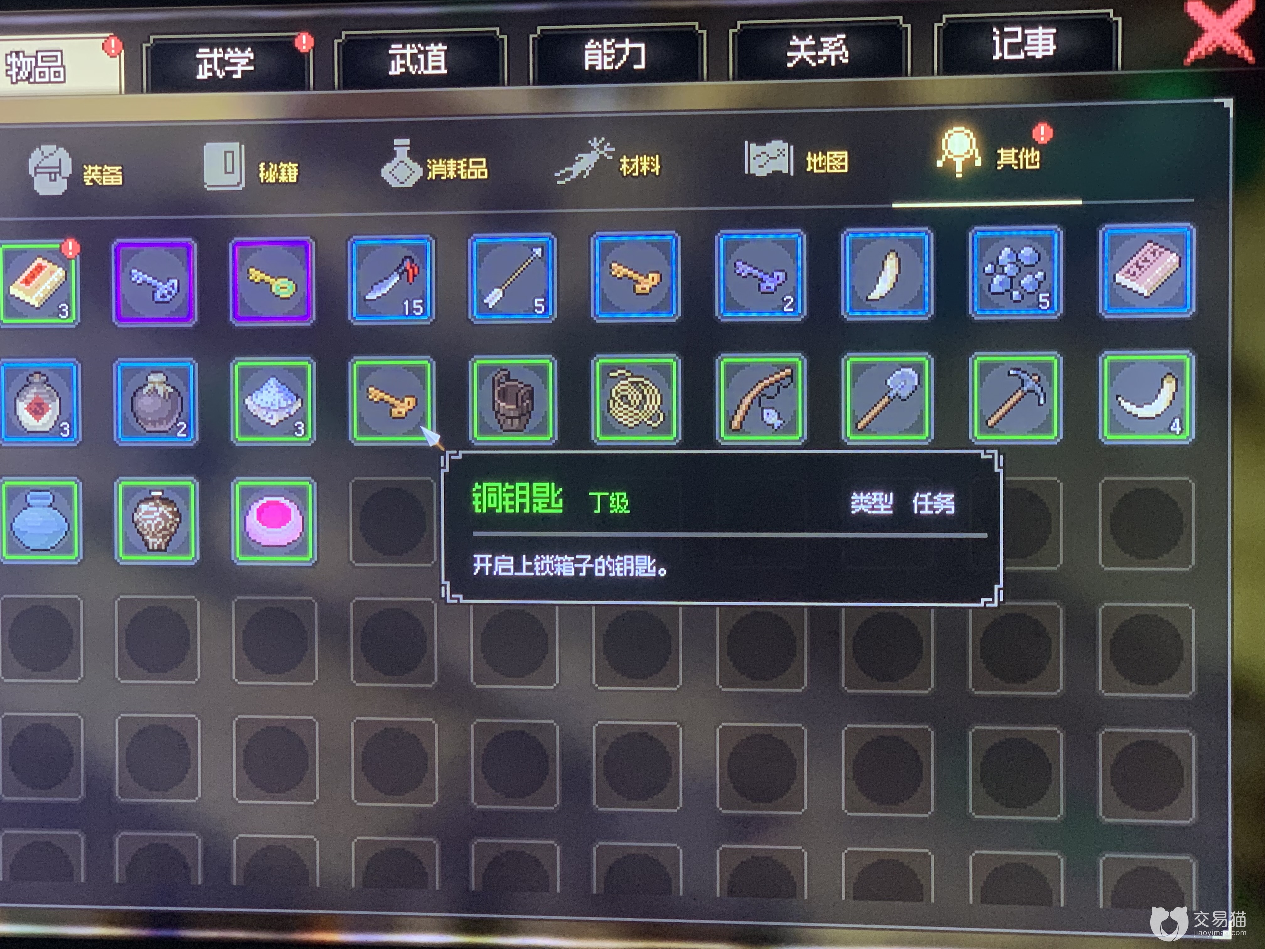 大侠立志传铜钥匙是游戏里的任务开箱道具之一,大侠立志传这款游戏里有不少可探索内容,玩家会在部分地方获得铜钥匙,而铜钥匙要来开启指定宝箱,下面一起来看看目前版本的铜钥匙的相关介绍,因为现在还是试玩版,游戏内容也是不完整的,很多地方还需要正式版来完善。