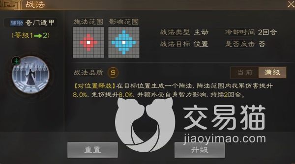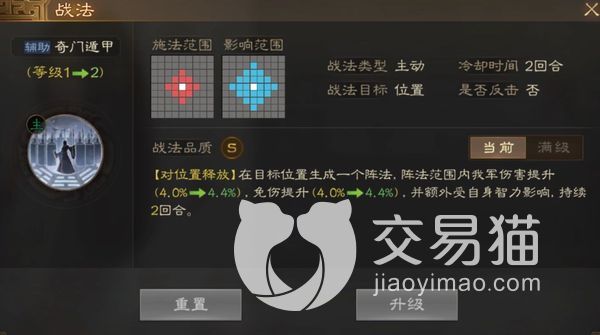 关于这个角色的战法选择,大家可以去选择奇门遁甲,当这个战法处于一级状态的时候,可以直接对角色群众的地方进行制作一个法阵,可以让处在该法阵里面己方的武将伤害提升4%,而免伤能力也会提升4%,并且受到角色智力影响,维持两个回合。