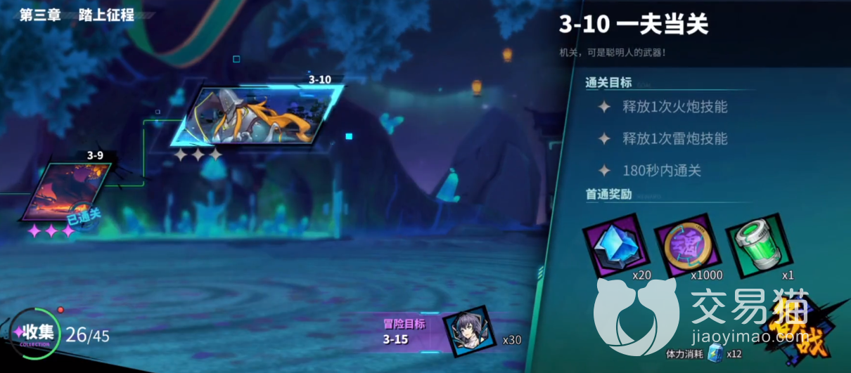 主线关卡3-10标题是一夫当关,挑战消耗体力12点,玩家需要使用剧情指定角色唐流雨,这一关有三个目标:释放一次火炮技能、释放一次雷炮技能、在180秒内通关。从目标任务可见,这一关属于熟悉玩法放技能的半教学关,所以通关难度不高,难点就在于如何熟悉玩雷与火装置。