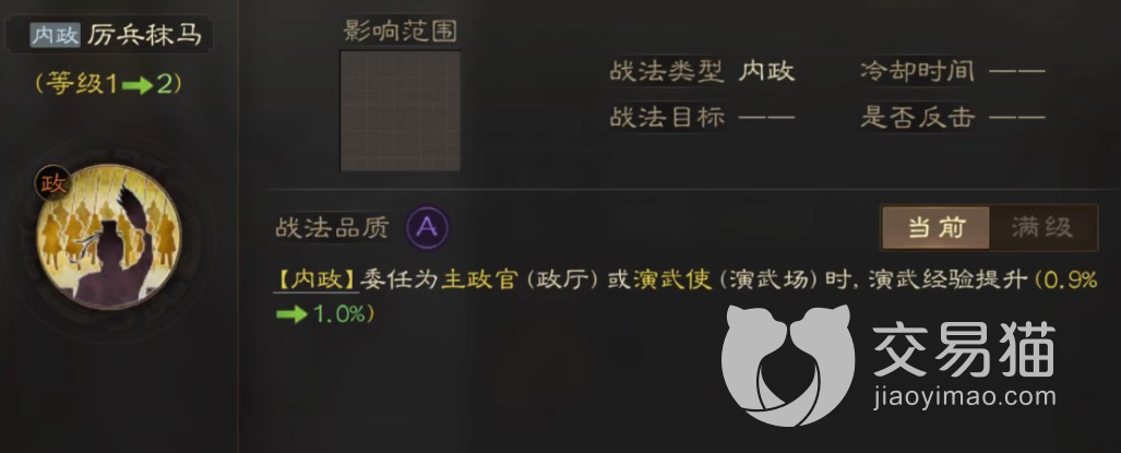 战法方面他的两个战法都是内政战法,都不是战斗用,那就代表他的盾兵兵种完全没有作用了他上战场只能给白,通过这个可以看出他不是一位战场武将而是一位内政武将,那面板方面可以直接放弃了,内政武将只看战法效果不看面板,他的两个战法效果都是提升演武经验加成的,加一起可以提升2.7的经验加成,在演武方面有这个加成是非常重要的。