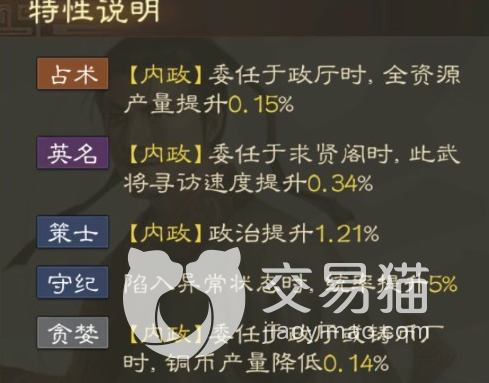 战法之外还要看的就是特性,特性方面吕范的战法还是非常强势的,他的特性全是高属性的内政增益特性,效果可以提升资源的产量、提升寻访的速度、提升政治属性,这个特性加成是非常高的对内政有很大的帮助。