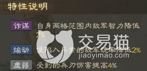之后是特性,特性方面,他拥有两个增益特性和一个dbuff特性,增益特性的效果是降低敌方的属性,dbuff特性的效果则是被攻击时受到的伤害提升,这个dbuff特性是非常难搞的,因为他的兵种是配置是盾兵,盾兵是前排定位,他本来属性就不高,在有个dbuff增伤特性他在战斗中很容易暴毙。