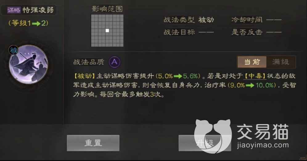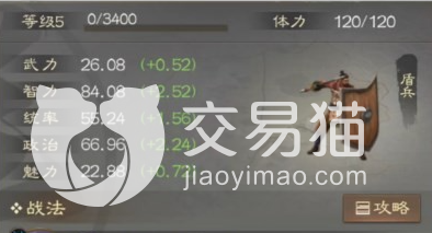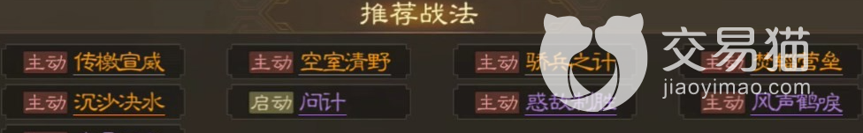 这第二个要看的属性就是战法配置,他的战法配置为两个被动战法,其效果可以提示谋略伤害,并且会对处于中毒状态中的敌人造成谋略伤害,之后会恢复友方的兵力,一个回合中最多可以触发三次,记住了这是被动触发没有任务条件,这个效果就很bug了,配合上一些可以上毒buff的武将,他的战法是非常强力的。