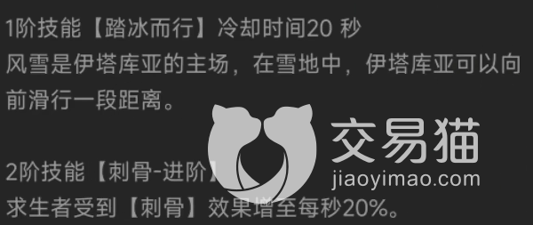技能方面都和冰雪有关,主动可以召唤雪地,然后让求生者速度降低,另外一个被动是额外叠加buff,叠满可以让求生者获得百分百的易伤,让守夜人更容易将恐惧值打满。然后让风雪中的密码机也无法被破译。